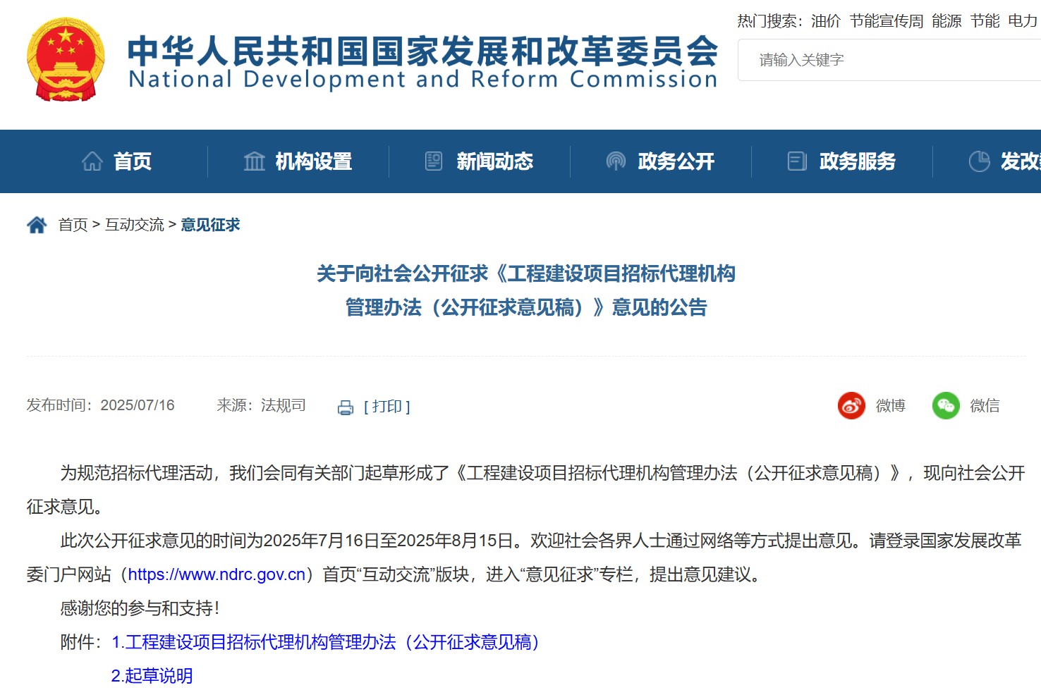 為規(guī)范招標代理活動,國家發(fā)展和改革委員會會同有關部門起草形成了《工程建設項目招標代理機構管理辦法(公開征求意見稿)》,現向社會公開征求意見。此次公開征求意見的時間為2025年7月16日至2025年8月15日。